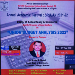 As part of the Annual Academic Festival-SRUJAN FEST, the department of Accountancy organizes the guest lectures for students every year,jointly with Commerce and Economics departments. The department gets the overwhelming response in this academic festival.