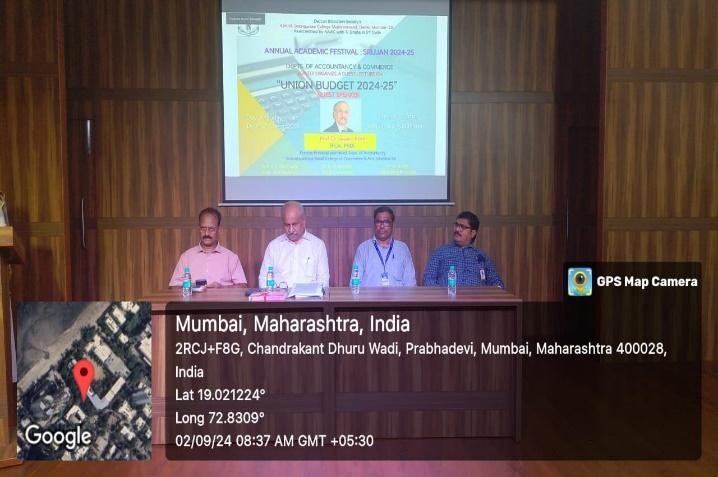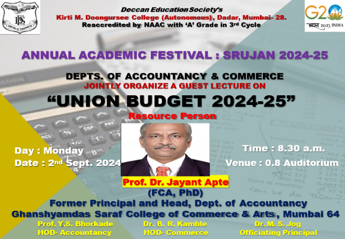 The departments of Accountancy and Commerce jointly organized a guest lecture on the topic “UNION BUDGET 2024-25” on Monday, 2nd Sept. 2024 at 8.30 a.m. at 0.8 Auditorium. The Guest Speaker was Prof. Dr. Jayant Apte, FCA, Former Principal and HOD of Accountancy, Ghanshyamdas Saraf College of Commerce & Arts, Malad (E), Mumbai. He focused on the current situation of the economy as well as the highlights of the provisions of the Budget to keep up our economy.