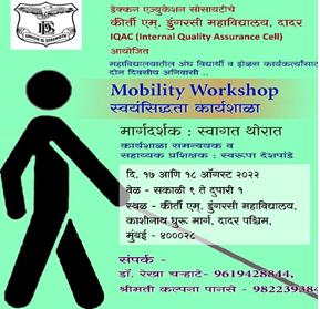 2. Mobility Workshop: We have always remained perplexed by the growing number of visually challenged students on our list of admissions. Along with all other activities, a two-day mobility workshop was organized to train 80 participants on 17th & 18th August, 2023. Under the able guidance of Mr. Swagat Thorat & Mrs. Swarupa Deshpande the workshop was a training for the visually-challenged students to get hands-on experience of how to use the white stick, to recognize different types of vegetables & fruits and the importance of daily exercise. It was an opportunity for all the participants to explore knowledge about Careers, good personality & an awareness of social situations.